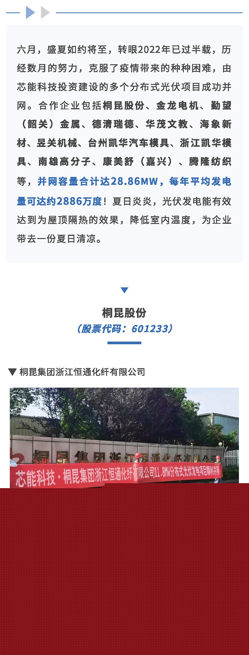 28.86MW!桐昆股份、金龍電機、海象新材等多個分布式光伏項目成功并網 2022-06-20 00:00:00 浙江芯能光伏科技股份有限公司 Viewd 5838 Previous賽峰集團3.82MW分布式光伏項目順利開工 Next芯能科技黨支部開展“追溯紅色記憶,汲取奮進力量”主題黨日活動