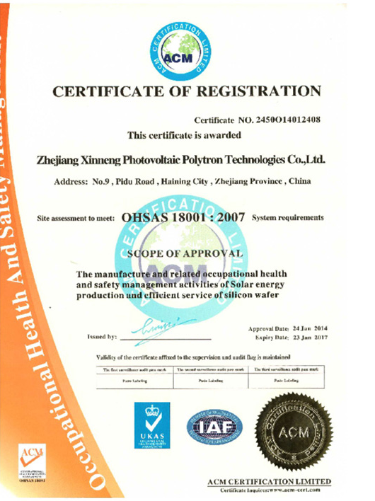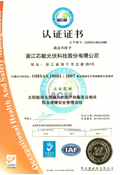 公司通過OHSAS18001:2007職業健康安全管理體系認證 2014-01-24 00:00:00 浙江芯能光伏科技股份有限公司 瀏覽次數 6930 上一條公司再次參加國際國內光伏博覽會 下一條沒有了