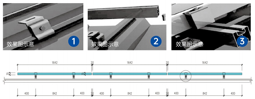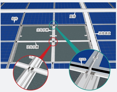 芯屋頂 BIPV 系統結構縱橫方向分別由主導水槽與次導水槽組成,下雨時,雨水流過光伏板并沿主次導水槽排向天溝,實現雙倍防水效果。